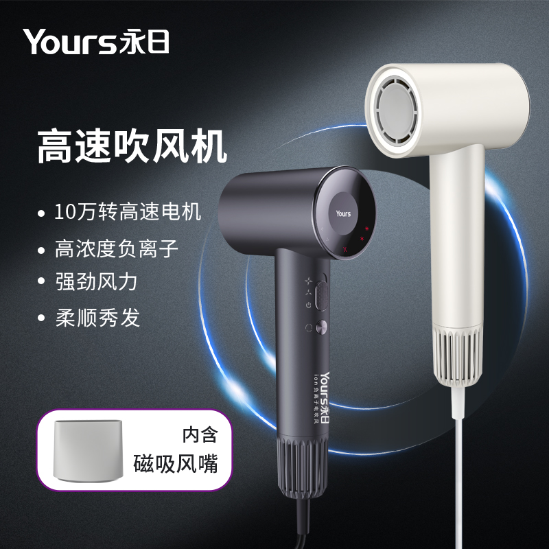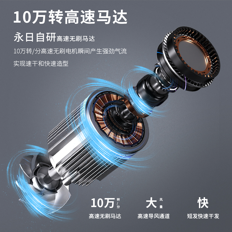特点:11万转高速马达+亿级负离子功能+LED档位控制显示+自清洁模式+9种吹发模式+285g轻量化设计+过热保护装置