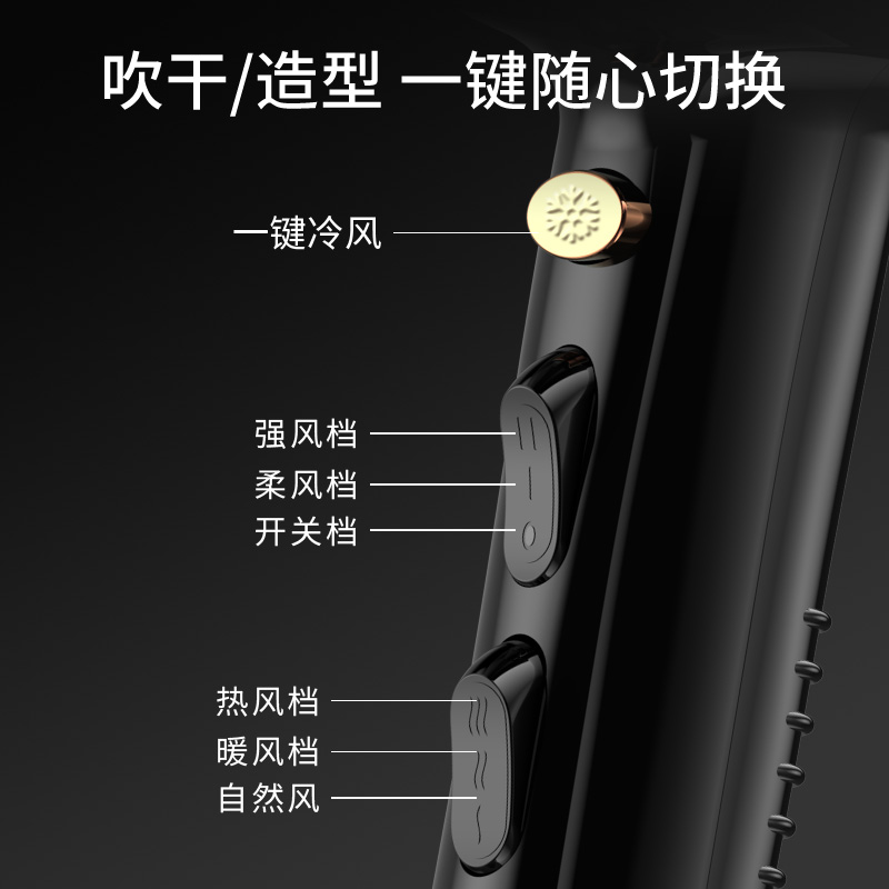 风速:两档 温度:急冷、温、热特点:千万级负离子+多档位调节+热量均衡+一键冷风+过热保护装置+防尘进风罩