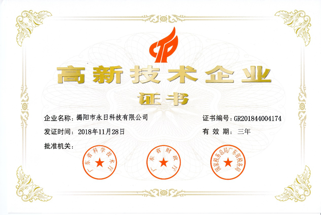 国家对高新技术企业的认定条件非常严格,门槛指标极高,任何一点不达标都不能认定为高新技术企业。本次的高新技术企业的认证,既是对广东永日科技有限公司的认可也是对公司的鞭策。